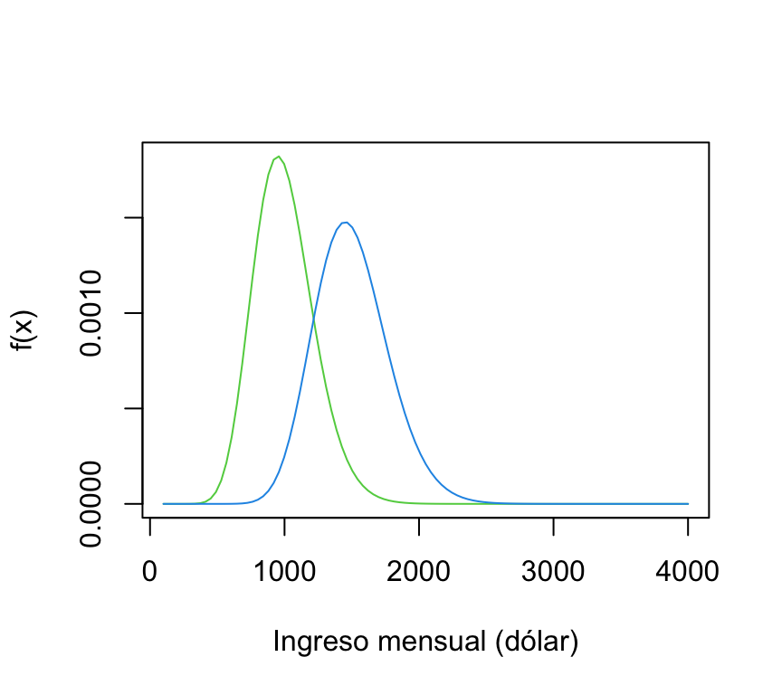 Densidad de la variable ingreso mensual por persona: Línea verde (país A), línea azaul (país B)