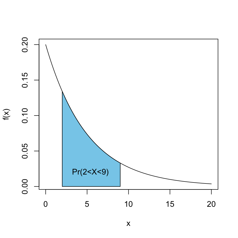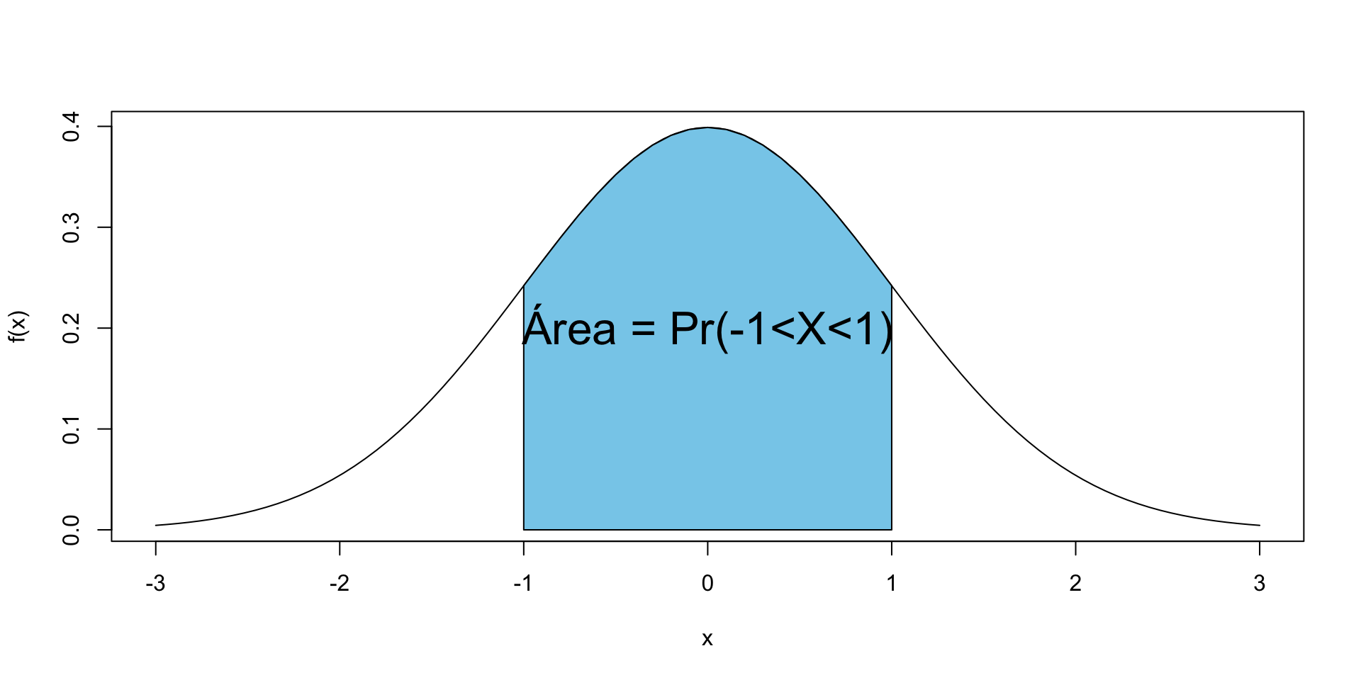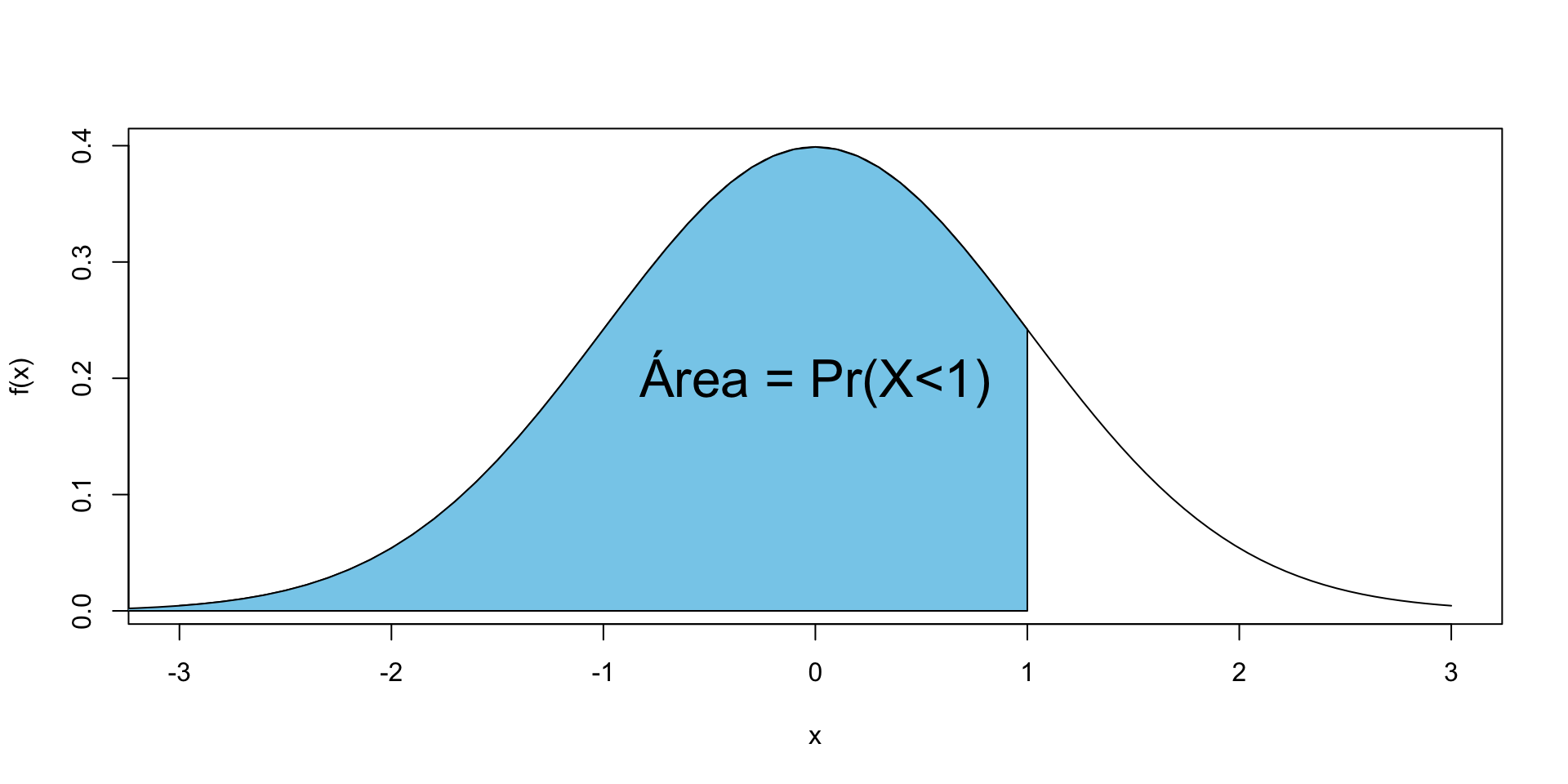 \[Pr(a<X<b)=\int_a^b f(x)dx=\text{Área bajo curva de $f(x)$}\]