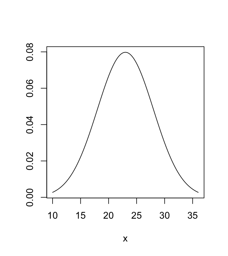 \(X\) denota el número de ventas en un día, entonces \(X\sim N(\mu=23,\ \sigma=5)\) ó \(X\sim N(\mu=23,\ \sigma^2=25)\)