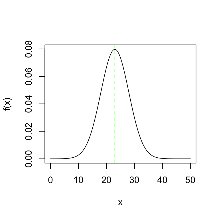 Ejemplo: Suponga que el número de ventas diarias de un almacén sigue la distribución \(N(\mu=23,\ \sigma=5)\), calcular probabilidad de que en un día determinado