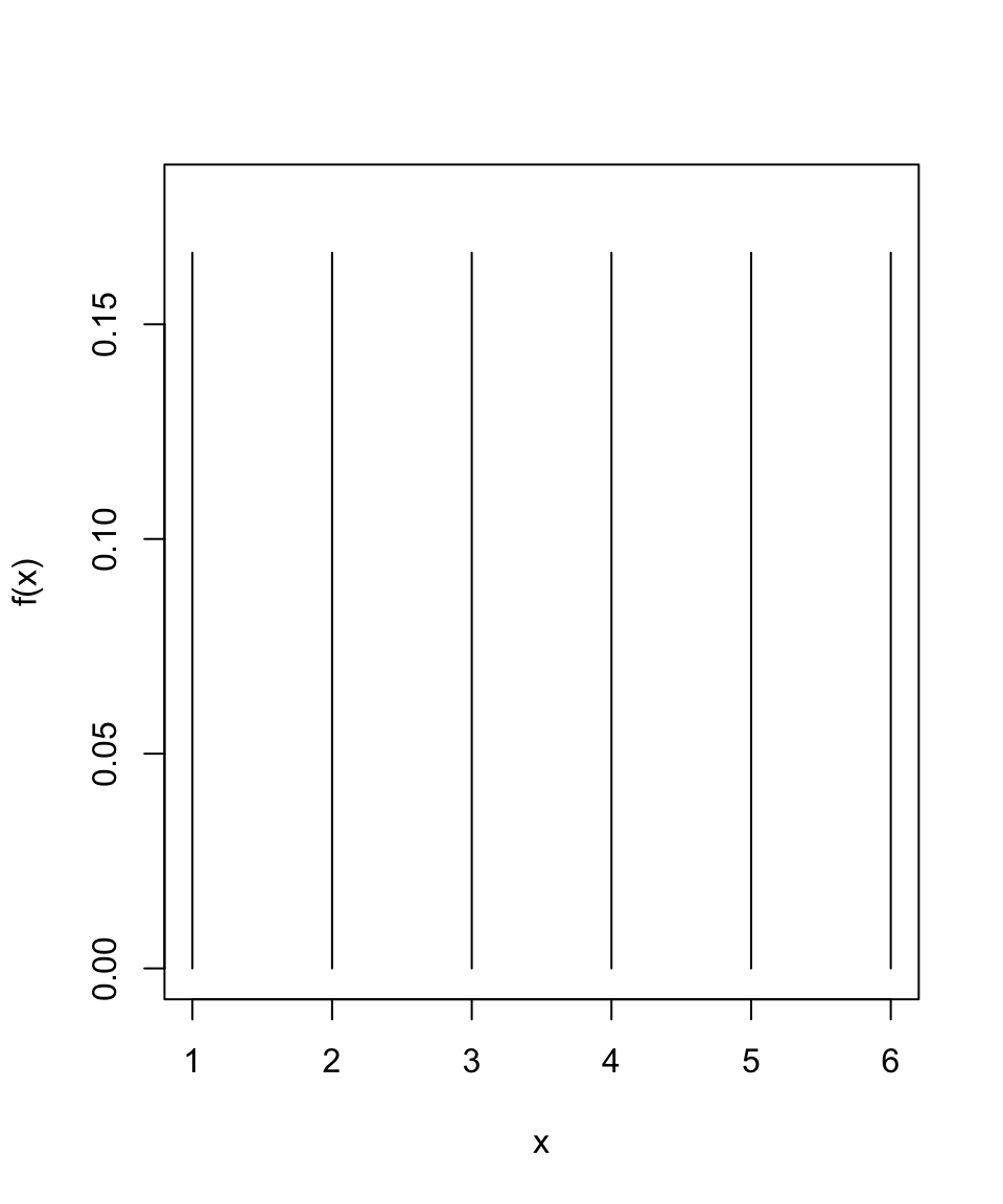 \[Pr(X=i)=1/6\ \ \ \text{para $i=1,...,6$}\] $$f(x)= \[\begin{cases} 1/6 &\text{si }x=1,2,...,6\\ 0 &\text{si no}\\ \end{cases}\]$$