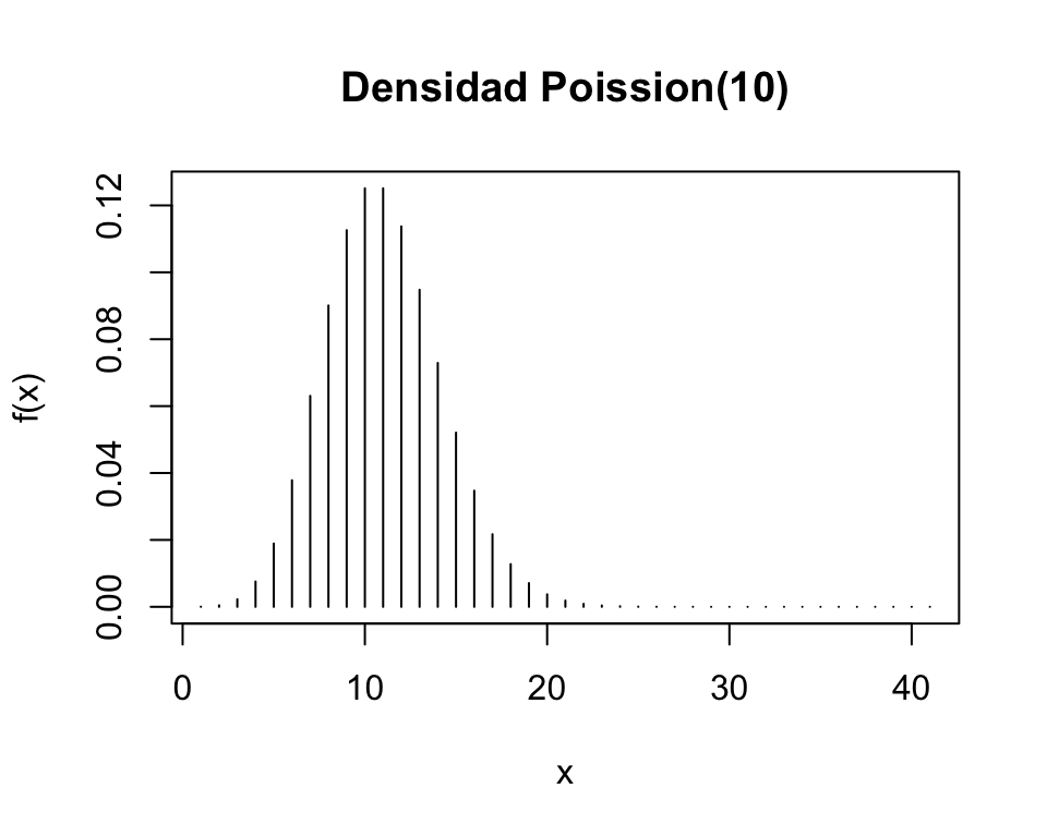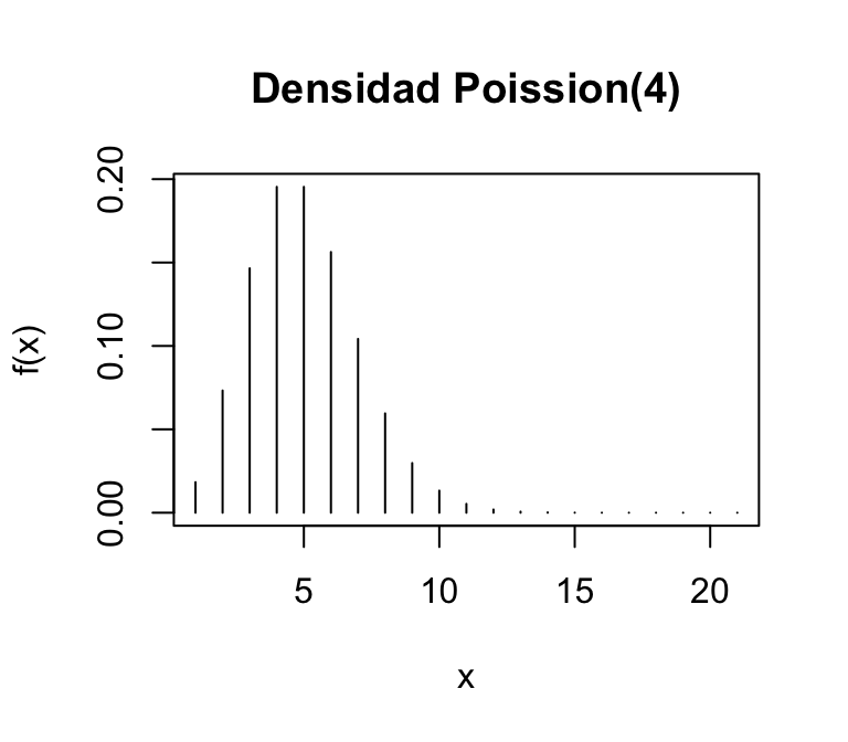 Si \(X\sim Poisson(\lambda)\), entonces \[f(x)=\begin{cases} \dfrac{e^{-\lambda}\lambda^x}{x!} &\text{si }x=0,1,2,...,\\ 0 &\text{si no}\\ \end{cases}\]