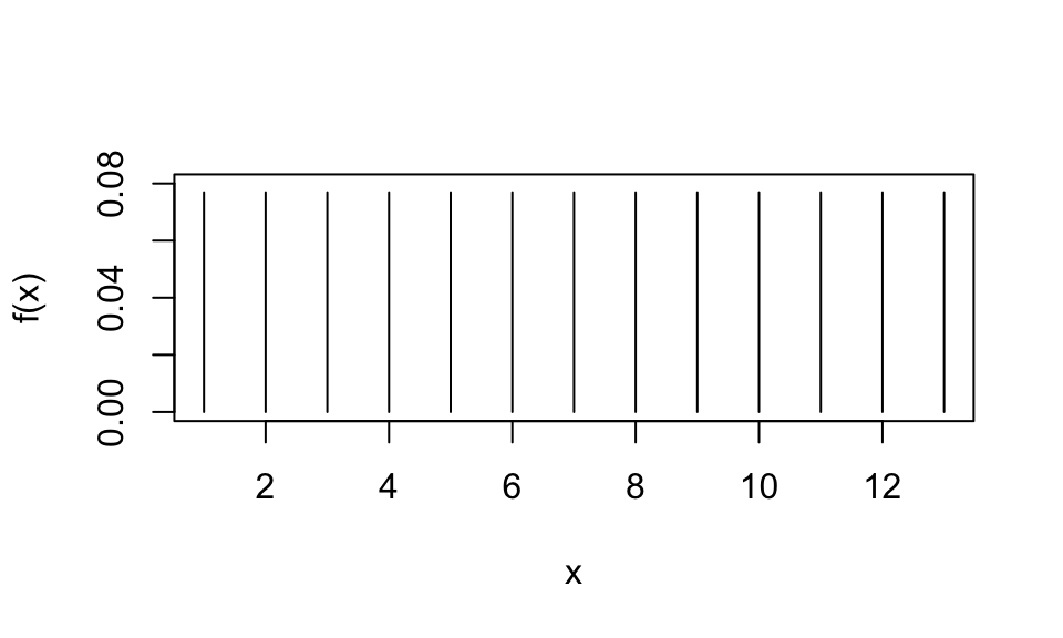 \[Pr(X=i)=1/13\ \ \ \text{para todo $i=1,...,13$}\]