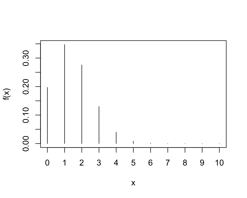 En el ejemplo de seguros de autos, \(E(X)=10*0.15=1.5\) autos, coincide lo observado en la gráfica de \(f(x)\): los valores más probables son: 0, 1, 2, y 3.