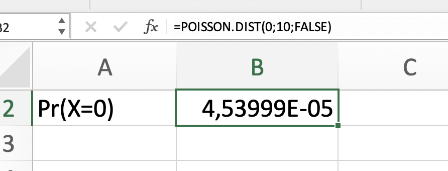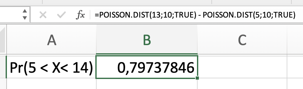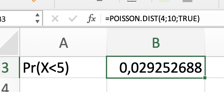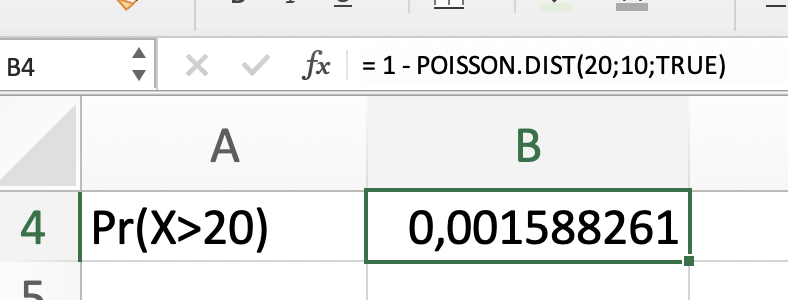 \[\begin{equation*} f(x)=\begin{cases} \dfrac{e^{-10}10^x}{x!} &\text{si }x=0,1,2,...,\\ 0 &\text{si no}\\ \end{cases} \end{equation*}\]En Excel: usar la función POISSON.DIST